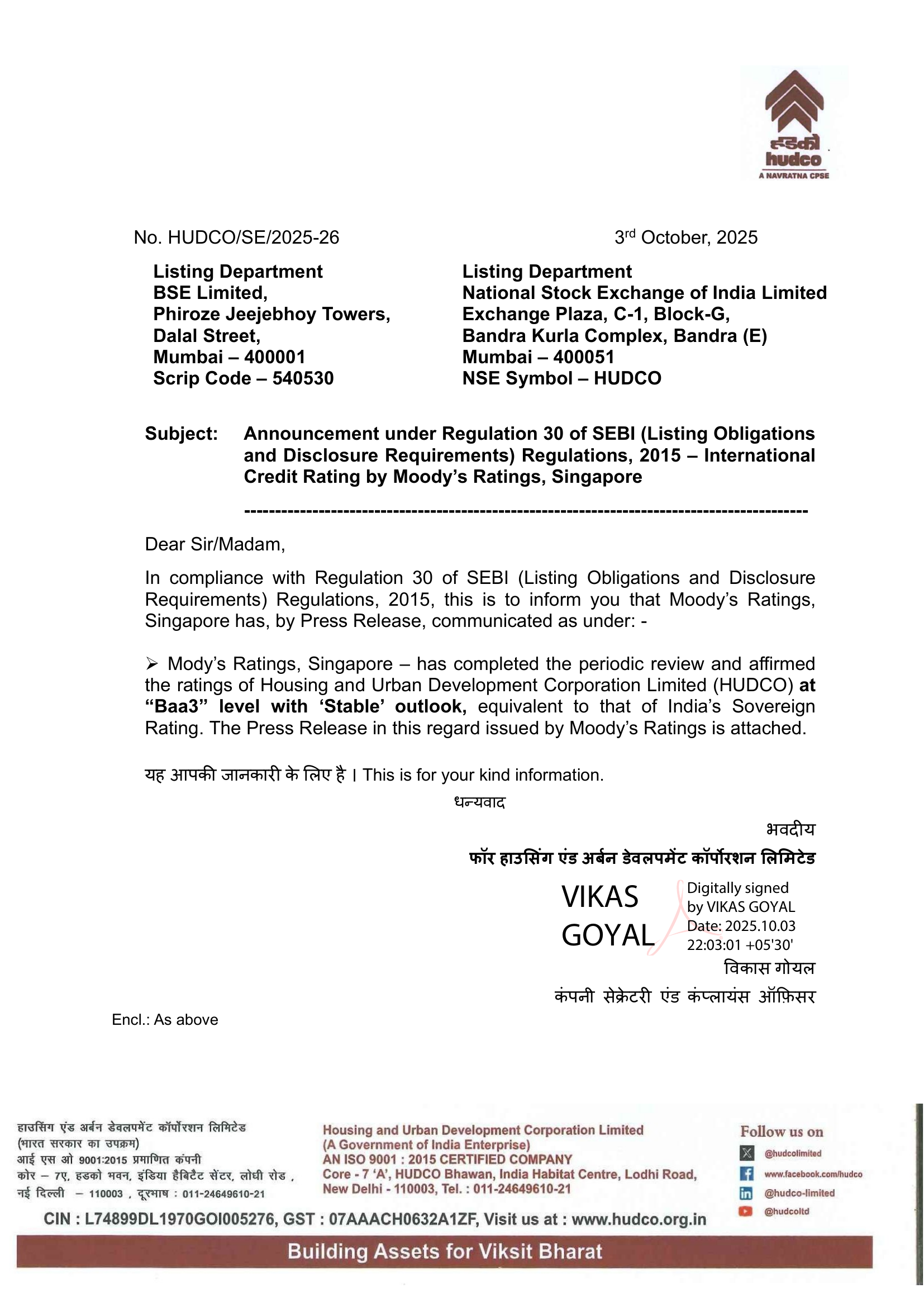 HUDCO Baa3 Rating Affirmed by Moody's Moody's has affirmed HUDCO's Baa3 issuer rating with a stable outlook, supported by strong government backing. Monitor for potential upgrades if sovereign ratings improve or liquidity strengthens; downgrades possible if sovereign ratings decline or asset quality deteriorates. Original Filing: www.bseindia.com/stock... $HUDCO.NSE #CreditRating