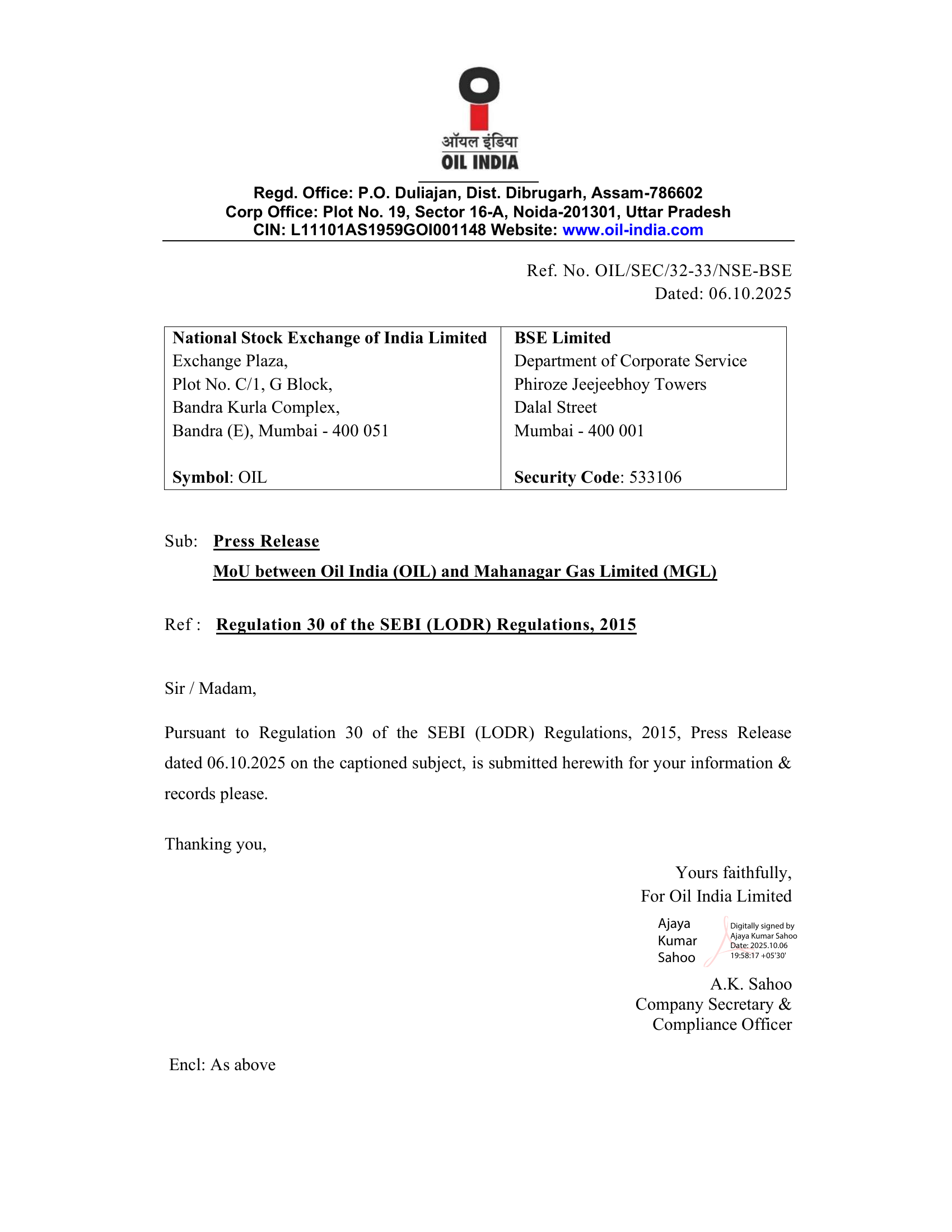 Oil India and Mahanagar Gas Collaborate on LNG & Clean Energy Oil India Limited and Mahanagar Gas Limited have signed an MoU to collaborate on LNG and clean energy projects, focusing on expanding gas production, LNG retail, and developing greener logistics solutions. This partnership aims to explore opportunities across the LNG value chain and emerging clean energy sectors. Original Filing: www.bseindia.com/stock... $OIL.NSE