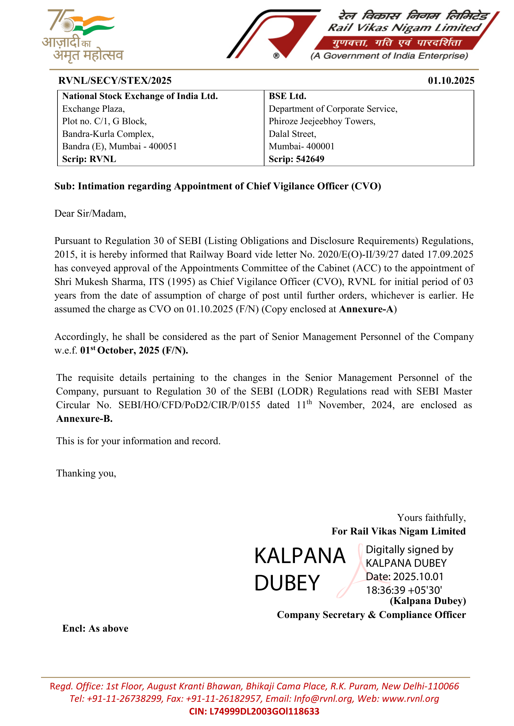 RVNL Appoints New Chief Vigilance Officer Rail Vikas Nigam Limited has appointed Shri Mukesh Kumar, ITS (1995), as Chief Vigilance Officer for a three-year term starting October 1, 2025. Kumar, currently PGM at BSNL Delhi, brings extensive vigilance experience from roles at the Central Vigilance Commission and RailTel. This strategic appointment was approved by the Railway Board and the Appointments Committee of the Cabinet. Original Filing: www.bseindia.com/stock... $RVNL.NSE #ManagementChange