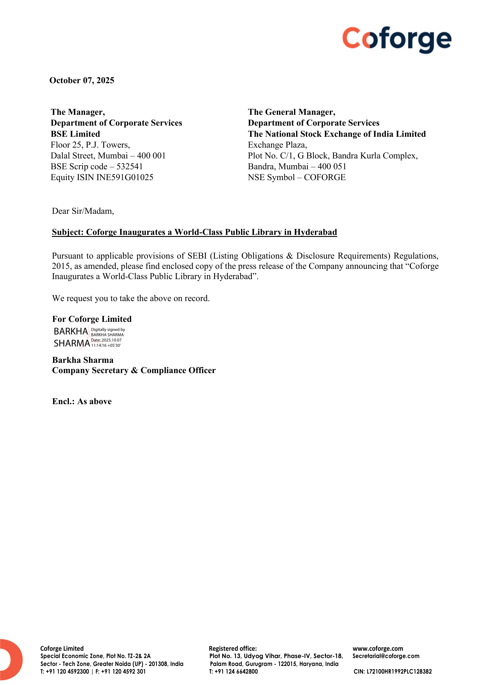 Coforge Launches New Public Library in Hyderabad Coforge Limited has inaugurated a new public library in Hyderabad as part of its CSR efforts, expanding its community development initiatives. The library offers extensive resources and operates daily, supporting inclusive learning. Original Filing: www.bseindia.com/stock... $COFORGE.NSE