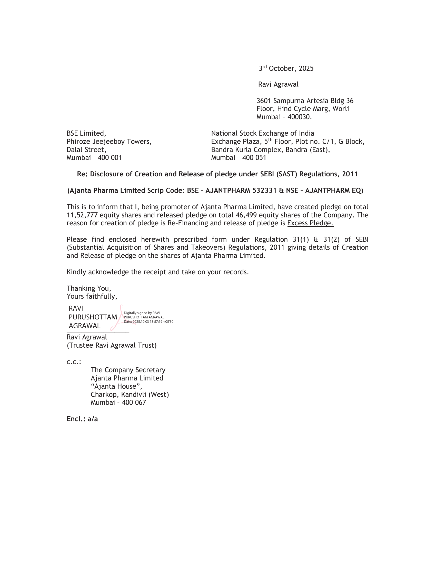 Ajanta Pharma Pledge Activity Update Promoter Ravi Agrawal pledged 11.52 lakh shares on 3rd Oct 2025, with partial release of 46,499 shares. Multiple pledge transactions occurred on 29-30 Sept 2025 involving several lenders. Shareholding remains significant with Ravi Agrawal Trust at 13.00% and Aayush M Agrawal Trust at 11.30%. Original Filing: www.bseindia.com/stock... $AJANTPHARM.NSE #pledge