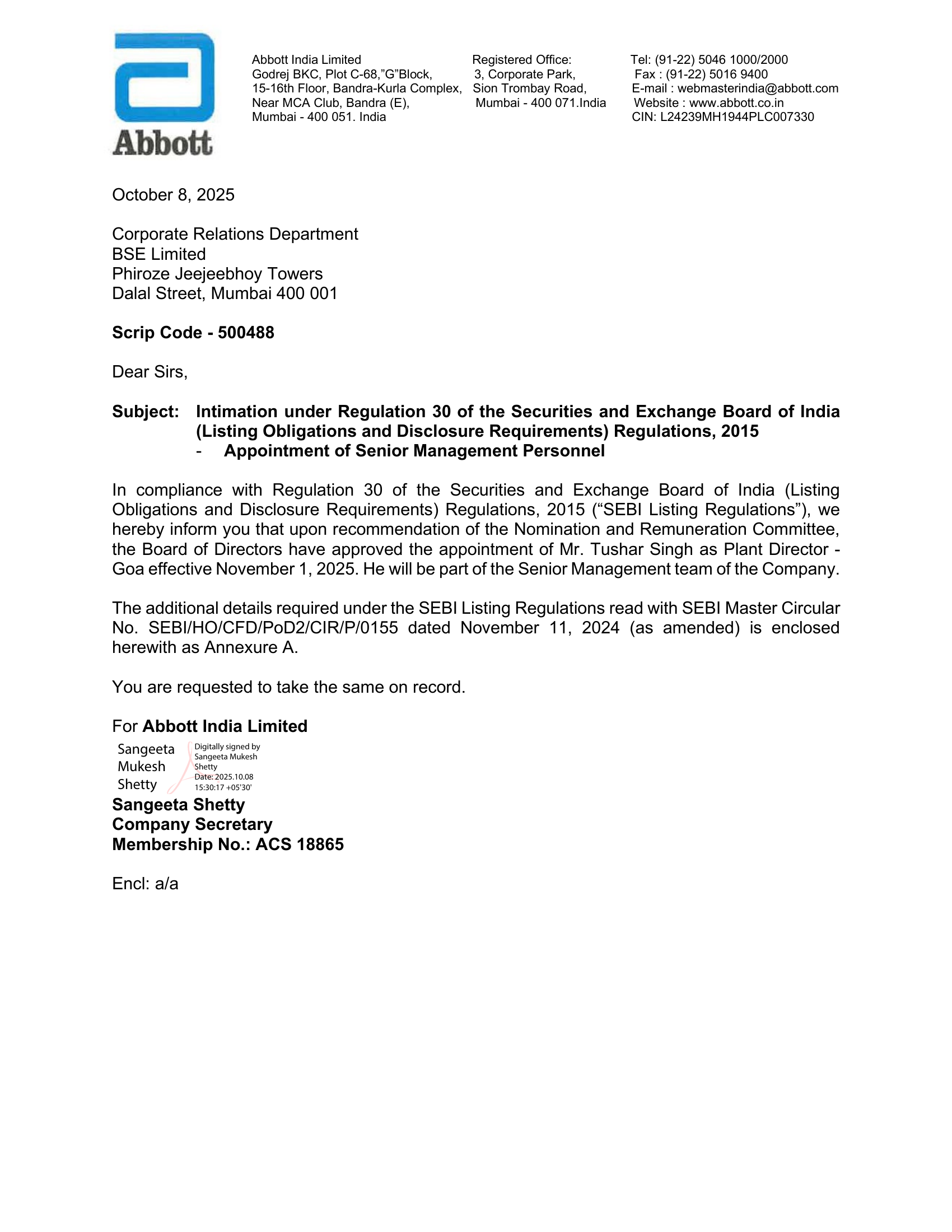Abbott India Appoints New Plant Director for Goa Abbott India Limited has appointed Mr. Tushar Singh as Plant Director for Goa, effective November 1, 2025. Mr. Singh, with Abbott since 2013 and diverse industry experience, was approved by the Board following Nomination and Remuneration Committee recommendations. Original Filing: www.bseindia.com/stock... $ABBOTINDIA.NSE #ManagementChange