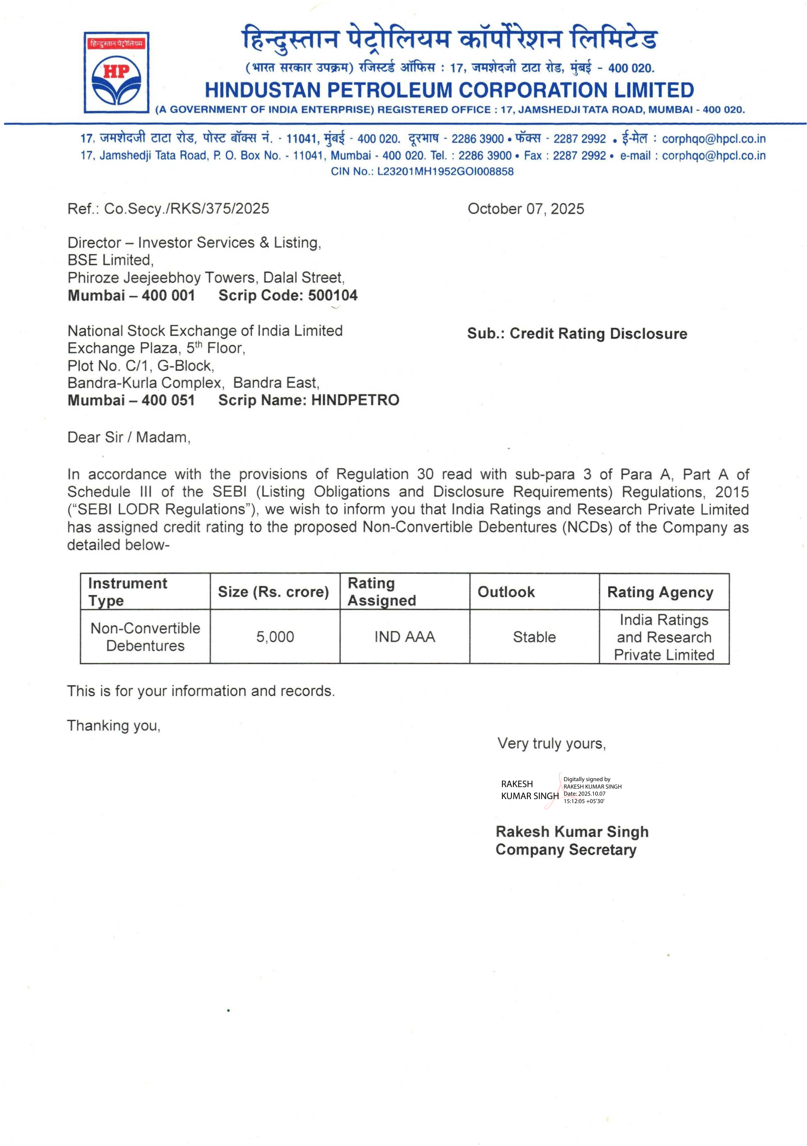 HPCL Receives IND AAA Credit Rating for Rs. 5,000 Crore NCDs India Ratings assigns a stable IND AAA rating to HPCL's proposed Rs. 5,000 crore NCDs, indicating high creditworthiness. This positive rating may impact HPCL's borrowing costs and investor confidence. Original Filing: www.bseindia.com/stock... $HINDPETRO.NSE #CreditRating