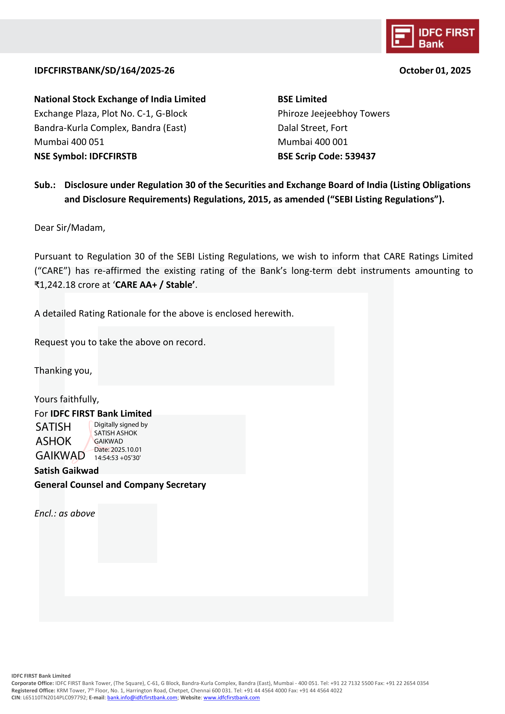IDFC First Bank Debt Rating Reaffirmed at CARE AA+ IDFC First Bank’s long-term debt ratings reaffirmed at CARE AA+ / Stable. Debt amount reduced to ₹1,242.18 crore. Improvements noted in operational scale, retail advances, and deposit growth; CASA ratio at 47.99%. Profitability remains moderate; asset quality stable with GNPA at 1.97%. Monitor for credit costs and asset quality trends. Original Filing: www.bseindia.com/stock... $IDFCFIRSTB.NSE #CreditRating
