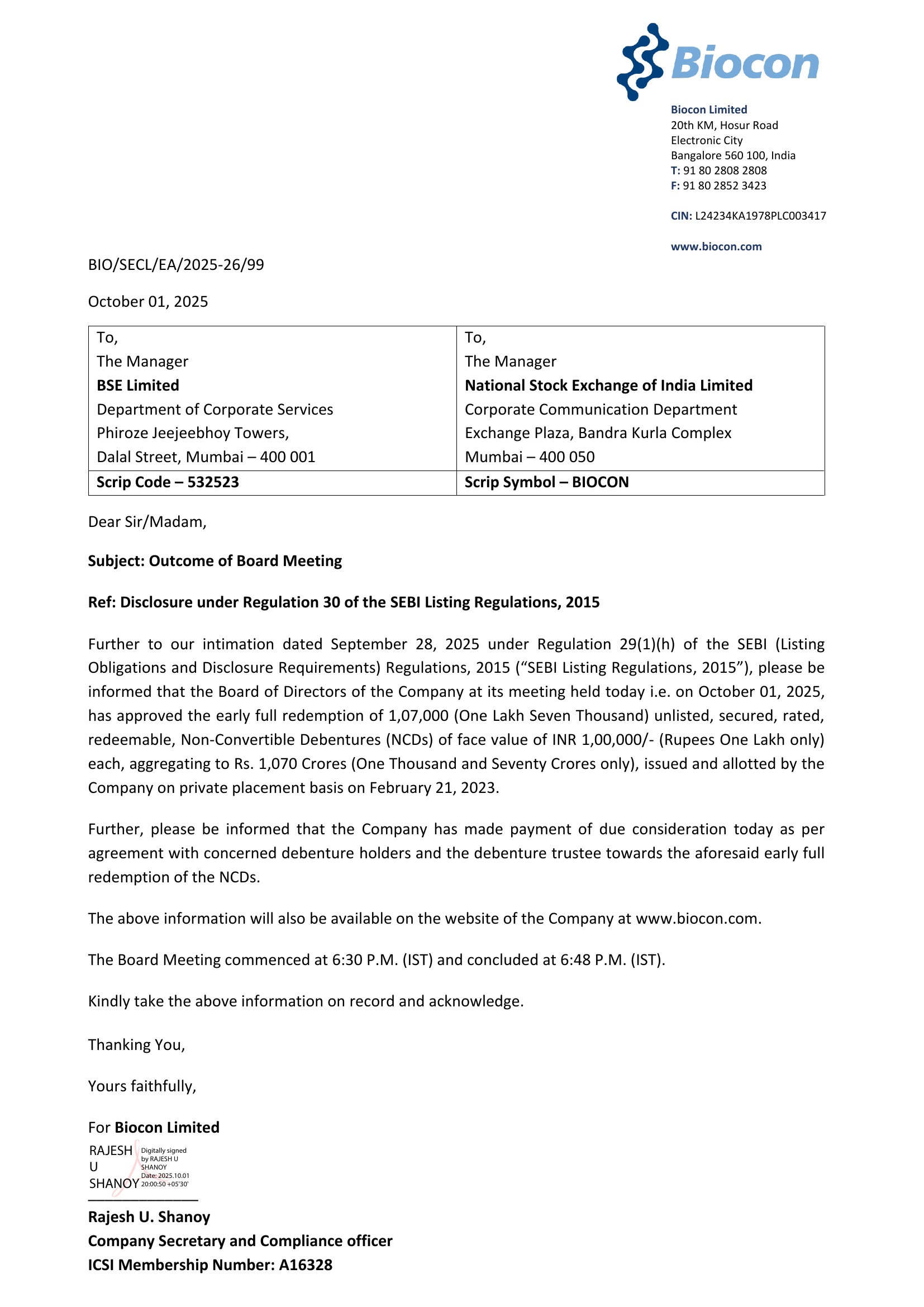Biocon Limited Redeems Debentures Early Biocon Limited has completed the early redemption of INR 1,070 crore in secured, rated, non-convertible debentures issued in February 2023, following board approval. This move may impact the company's debt profile and liquidity. Original Filing: www.bseindia.com/stock... $BIOCON.NSE