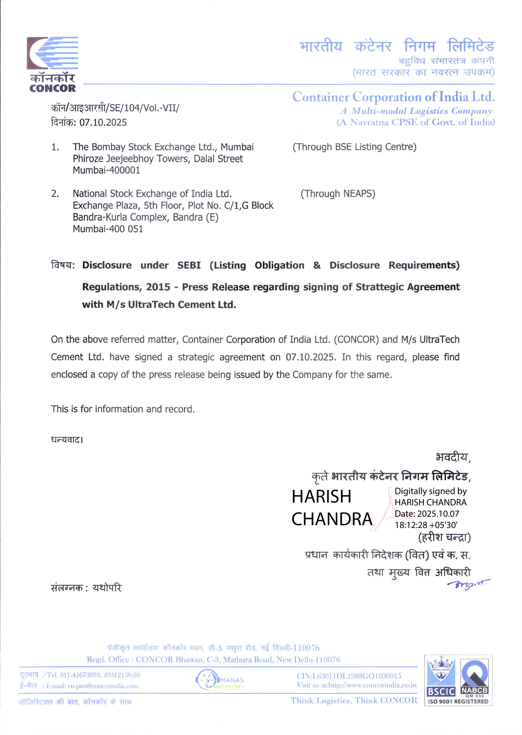 CONCOR and UltraTech Cement Sign Strategic Logistics Agreement CONCOR and UltraTech Cement have signed a strategic partnership to enhance bulk cement transport via specialized rail containers, promoting sustainable logistics and modal shift from road to rail. Original Filing: www.bseindia.com/stock... $CONCOR.NSE