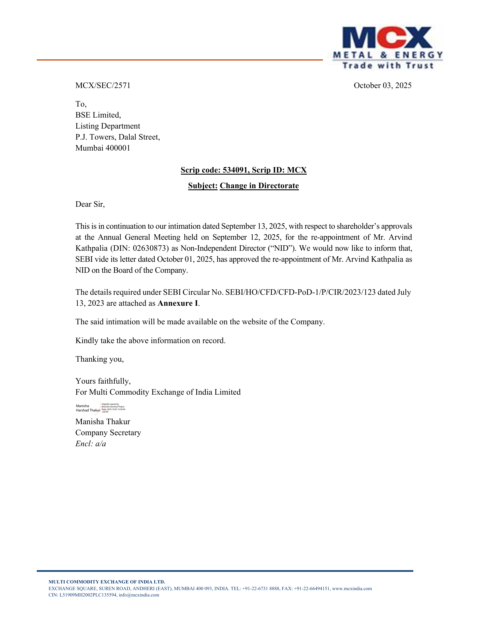 MCEI Reappoints Mr. Arvind Kathpalia as Non-Independent Director Multi Commodity Exchange of India Ltd. has re-appointed Mr. Arvind Kathpalia as Non-Independent Director, with SEBI approval received on October 1, 2025. His term, approved at the September 12 AGM, is subject to retirement by rotation. Mr. Kathpalia brings over 40 years of financial industry experience. Original Filing: www.bseindia.com/stock... $MCX.NSE #ManagementChange