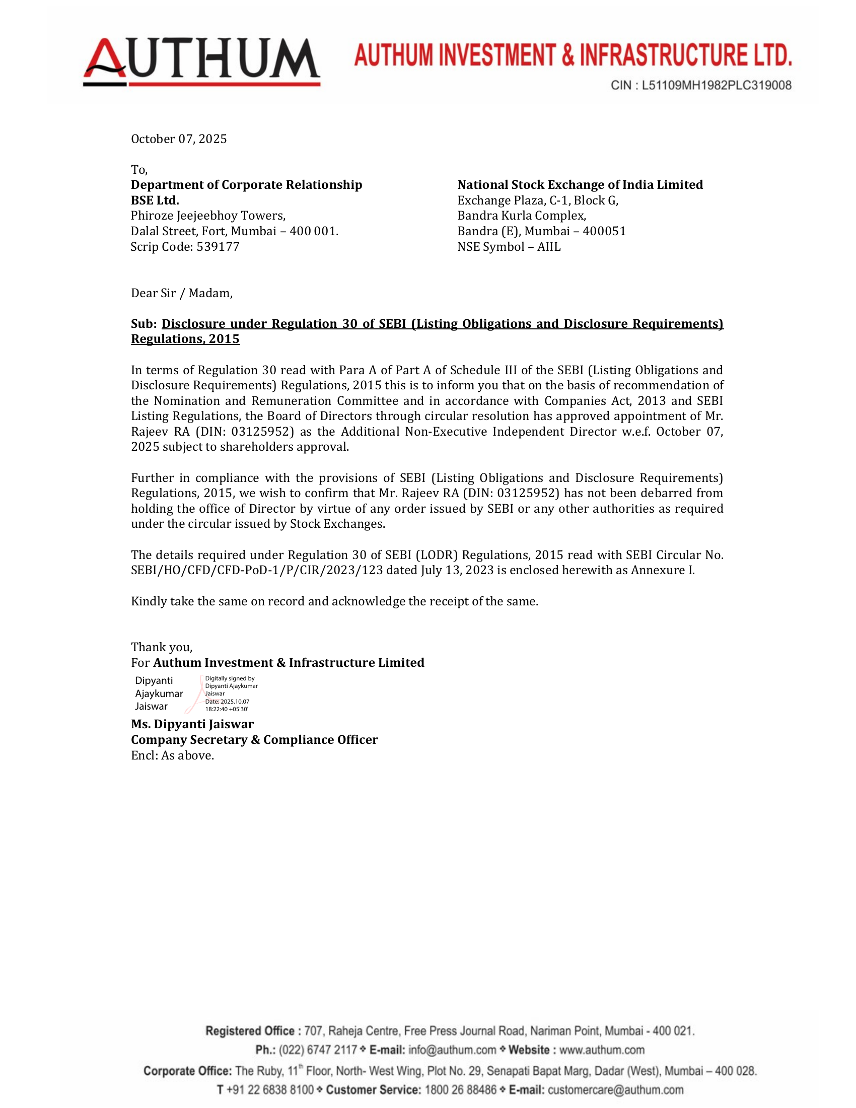 Authum Investment & Infrastructure Appoints New Independent Director Authum Investment & Infrastructure Limited has appointed Mr. Rajeev RA as an Additional Non-Executive Independent Director, subject to shareholder approval. Mr. RA brings over 34 years of experience in urban development, environment, and finance, with notable government roles. No debarment by SEBI or other authorities has been reported. Original Filing: www.bseindia.com/stock... $AIIL.NSE #ManagementChange