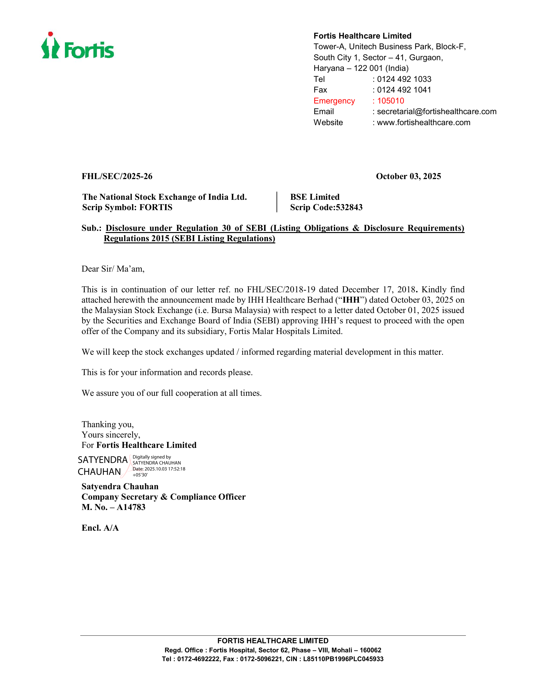 Fortis & Malar Open Offers Initiated; No Material FY25 Impact Expected SEBI-approved dispatch of updated offer letters for Fortis and Malar Open Offers has begun. Offer prices are INR170 and INR17.6 per share, respectively, with interest accruing from December 2022. No material impact on IHH Group’s FY25 earnings is anticipated; completion expected in Q4 2025. Original Filing: www.bseindia.com/stock... $FORTIS.NSE #OpenOffer