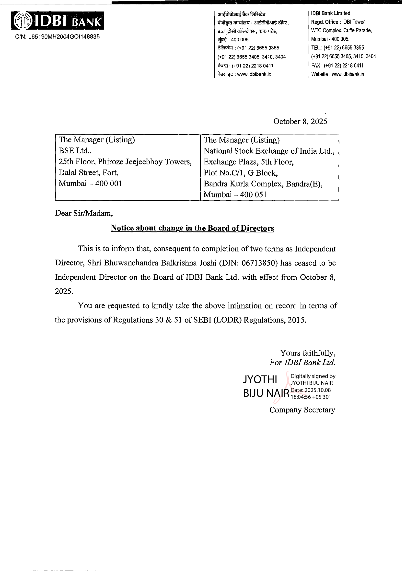 IDBI Bank Announces Board Change IDBI Bank has concluded Shri Bhuwanchandra Balkrishna Joshi's tenure as Independent Director, effective October 8, 2025, following SEBI compliance. Original Filing: www.bseindia.com/stock... $IDBI.NSE #ManagementChange
