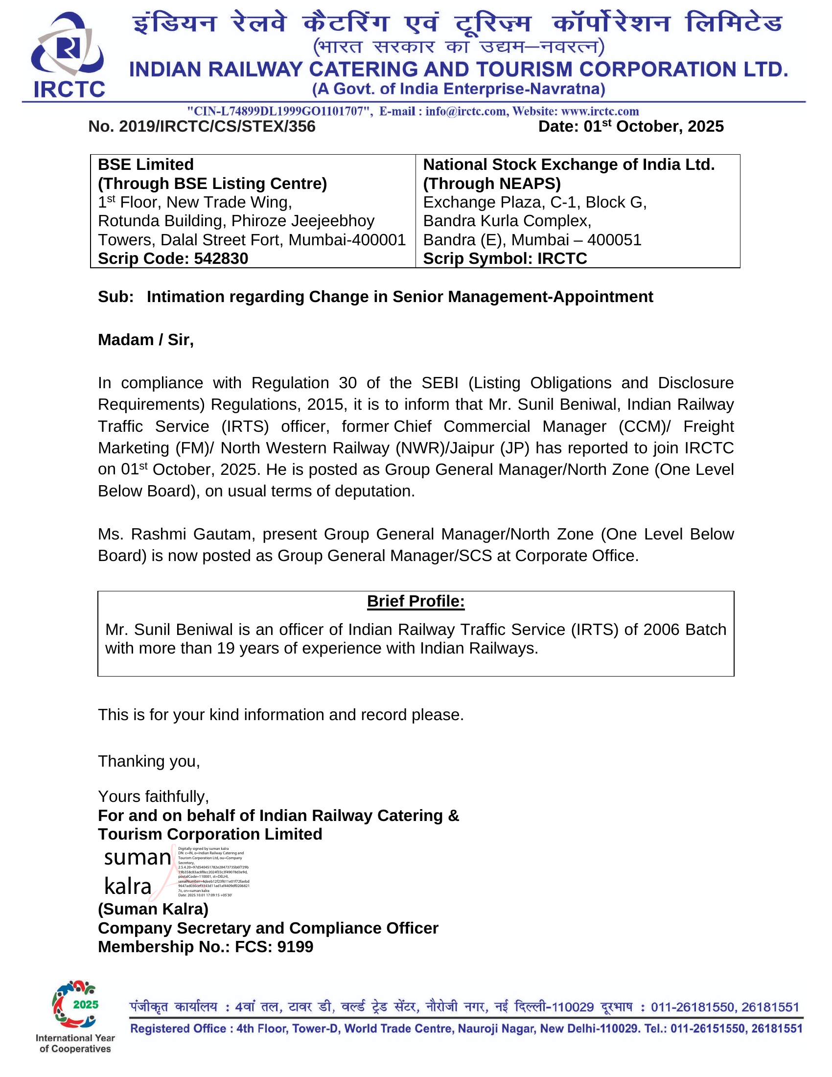 IRCTC Management Change Alert IRCTC appoints Mr. Sunil Beniwal as Group General Manager/North Zone, effective October 1, 2025, replacing Ms. Rashmi Gautam who has been reassigned to the Corporate Office. Original Filing: www.bseindia.com/stock... $IRCTC.NSE #ManagementChange