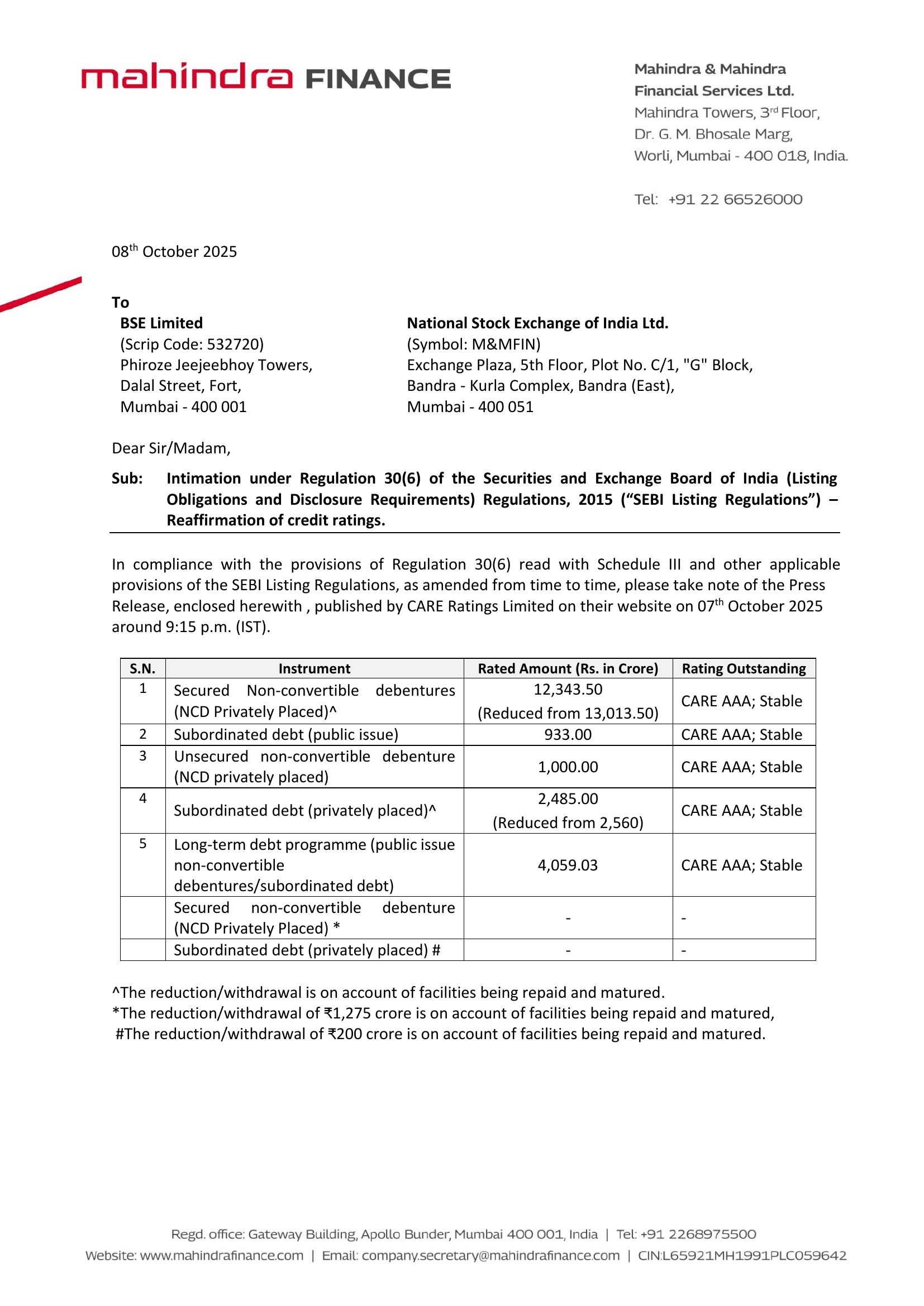 Mahindra & Mahindra Financial Ratings Reaffirmed at CARE AAA CARE Ratings has reaffirmed Mahindra & Mahindra Financial Services Limited's debt instruments at 'CARE AAA; Stable'. The company's strong capitalisation, diversified funding, and strategic importance support this rating. Slight increase in gross Stage 3 assets to 3.85% as of June 2025, with a healthy provision coverage ratio of 51.4%. Liquidity remains robust with ₹10,100 crore liquid investments against ₹8,053 crore debt obligations. Original Filing: www.bseindia.com/stock... $M&MFIN.NSE #CreditRating