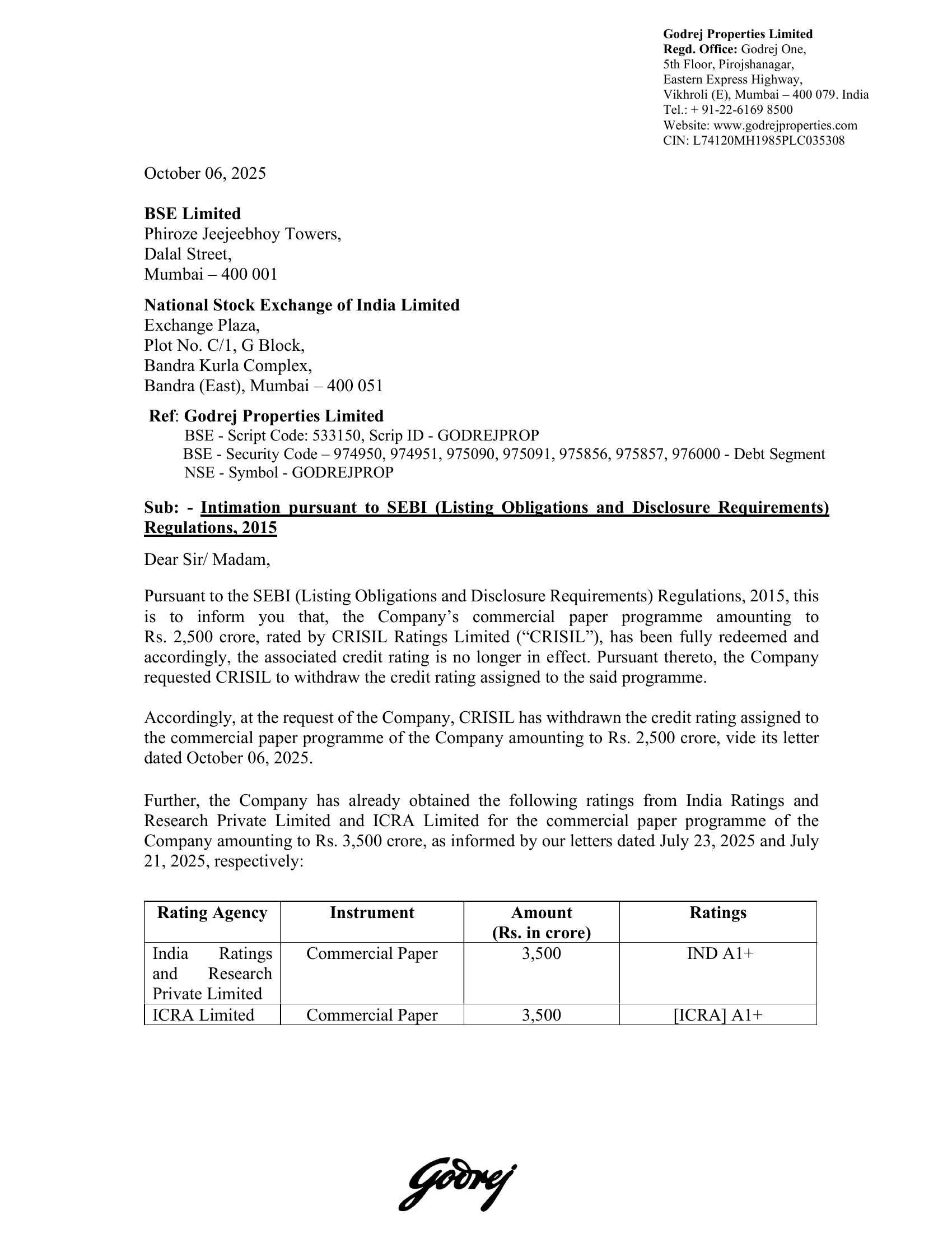 Godrej Properties Completes Commercial Paper Redemption and Secures New Ratings Godrej Properties Limited has fully redeemed its Rs. 2,500 crore commercial paper program, resulting in the withdrawal of its CRISIL rating. The company has obtained new ratings for a Rs. 3,500 crore commercial paper program from India Ratings and ICRA, both rated IND A1+ and [ICRA] A1+ respectively. Investors should note the rating updates and the completion of the redemption process. Original Filing: www.bseindia.com/stock... $GODREJPROP.NSE #CreditRating