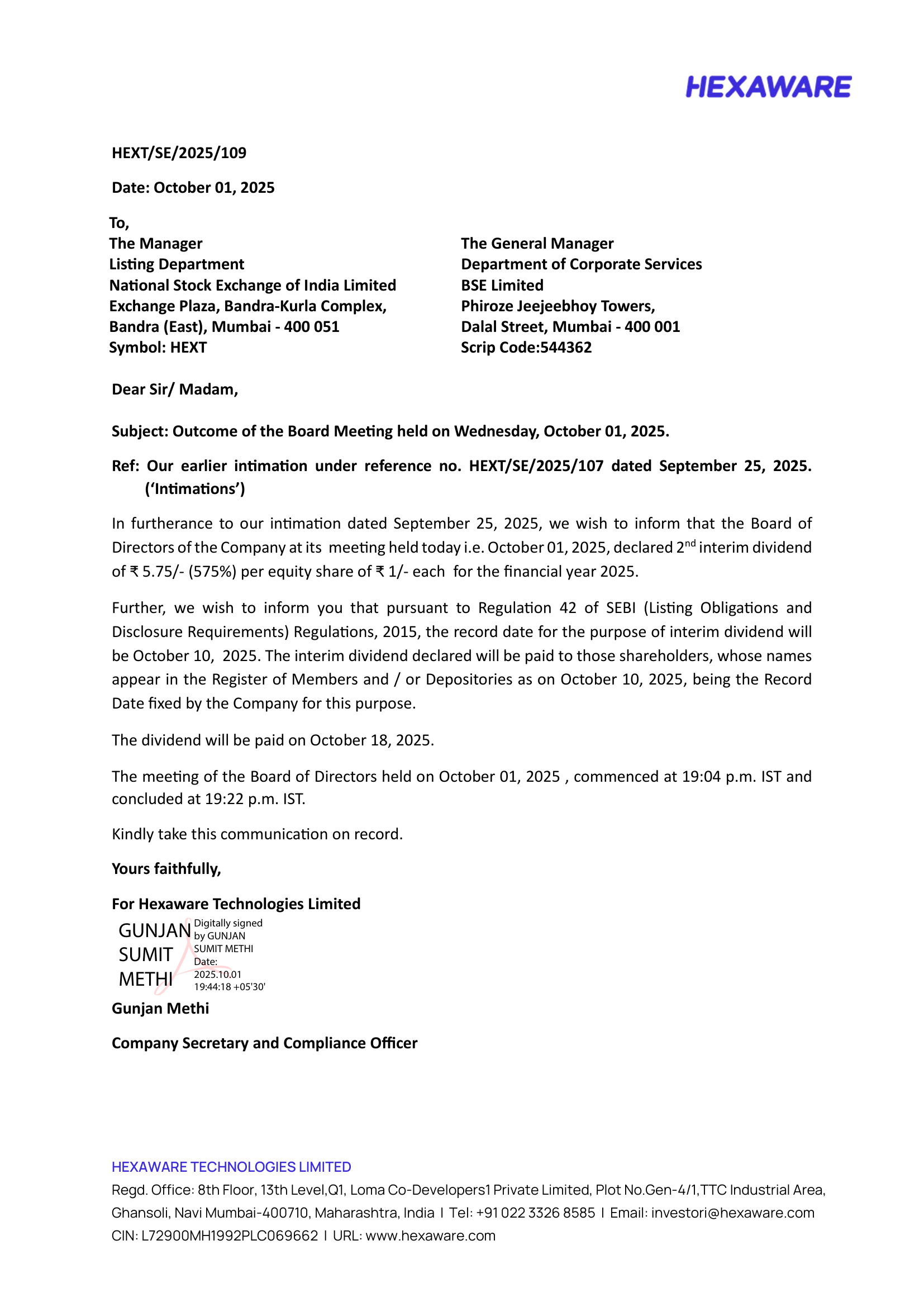 Hexaware Declares 2nd Interim Dividend for FY25 Hexaware Technologies Limited's board approved a 2nd interim dividend of ₹5.75 per share, payable on October 18, 2025, with a record date of October 10, 2025. Original Filing: www.bseindia.com/stock... $HEXT.NSE