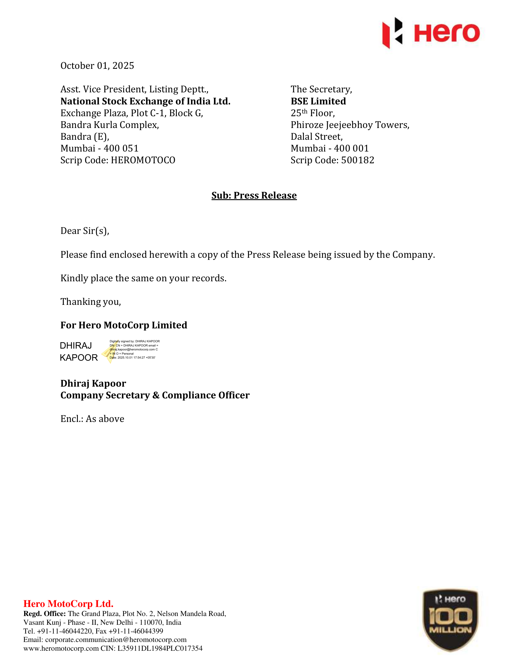 Hero MotoCorp September 2025 Dispatches & Growth Highlights Hero MotoCorp reports September 2025 dispatches of 687,220 units (+8% YoY), with domestic sales at 647,582 units and exports at 39,638 units. Achieved over 125 million units in cumulative production. Notable 19% YoY growth in VAHAN registrations and a 94.8% increase in Q2 FY26 global dispatches, fueled by new launches and EV expansion via VIDA. Strong festive season demand observed. Original Filing: www.bseindia.com/stock... $HEROMOTOCO.NSE