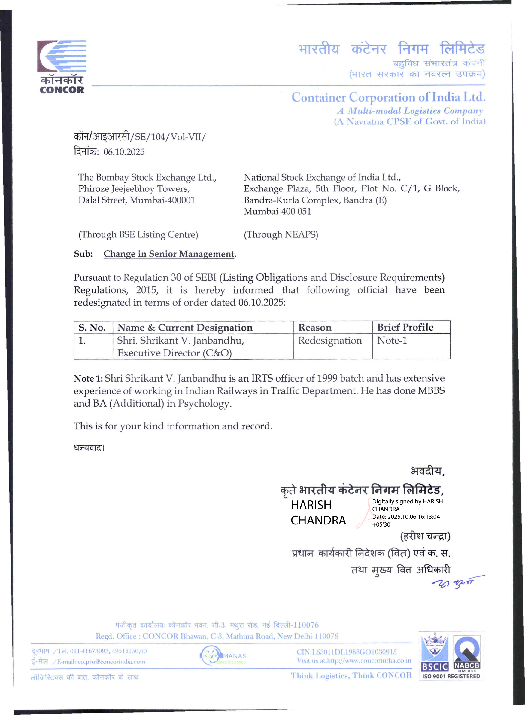 CONCOR Senior Management Update CONCOR has announced Shri Shrikant V. Janbandhu's redesignation as Executive Director (C&O). He brings extensive Indian Railways experience and diverse educational background. No immediate action required. Original Filing: www.bseindia.com/stock... $CONCOR.NSE #ManagementChange
