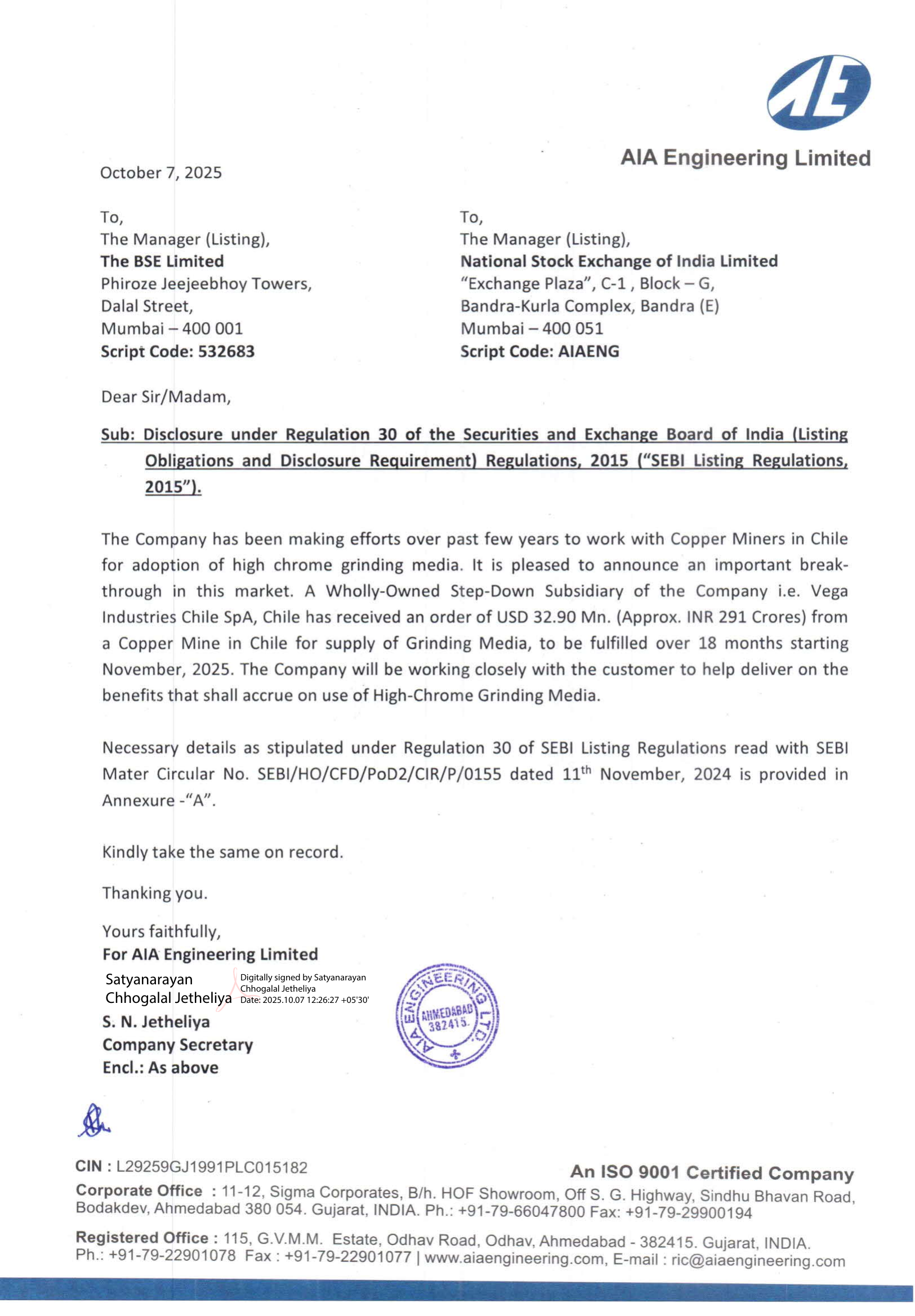 AlA Engineering Secures USD 32.9M Mining Equipment Order in Chile AlA Engineering's Chilean subsidiary, Vega Industries Chile SpA, received a USD 32.9 million order from a Chilean copper mine for high-chrome grinding media, to be fulfilled over 18 months starting November 2025. This reinforces AlA's strategic focus on the Chilean copper mining sector. Original Filing: www.bseindia.com/stock... $AIAENG.NSE