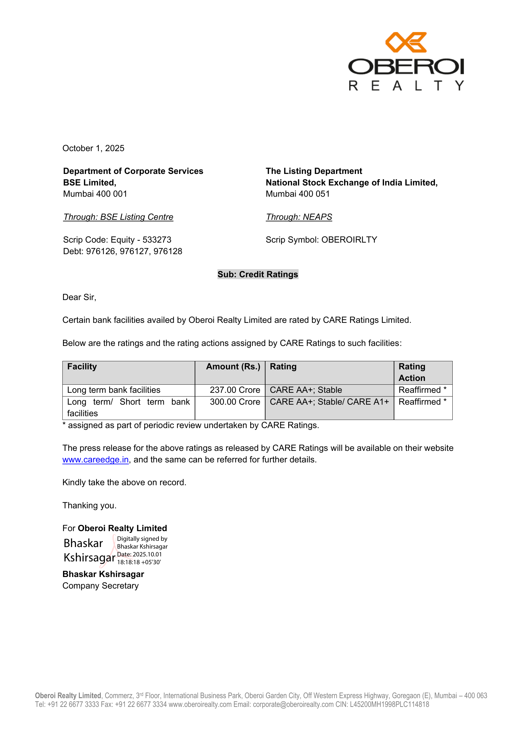 Oberoi Realty Credit Ratings Reaffirmed by CARE CARE Ratings has reaffirmed Oberoi Realty's credit ratings at CARE AA+; Stable for Rs. 237 crore long-term facilities and CARE AA+; Stable/CARE A1+ for Rs. 300 crore combined facilities, indicating maintained strong creditworthiness. Original Filing: www.bseindia.com/stock... $OBEROIRLTY.NSE #CreditRating