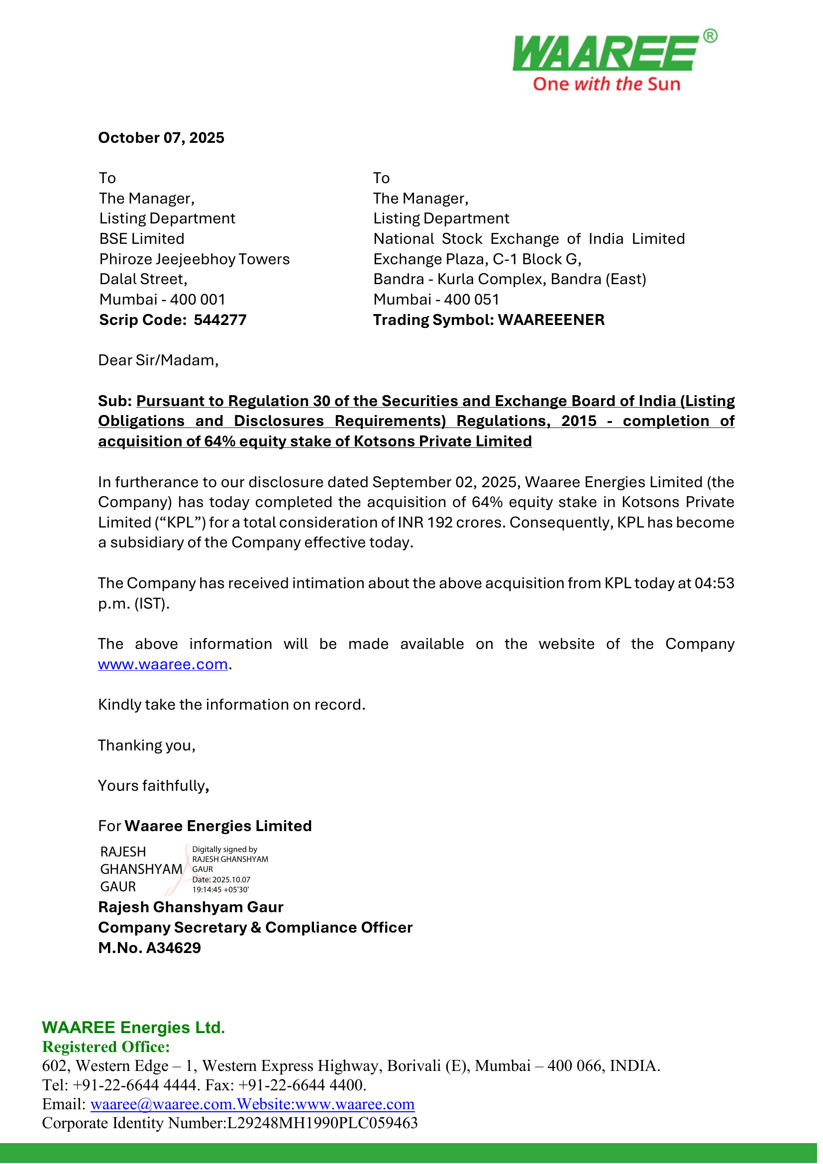 Waaree Energies Completes Acquisition of Kotsons Private Limited Waaree Energies Limited has finalized its acquisition of a 64% stake in Kotsons Private Limited for INR 192 crores, establishing KPL as a subsidiary. The transaction was completed today, with formal notification received at 04:53 p.m. IST. Original Filing: www.bseindia.com/stock... $WAAREEENER.NSE