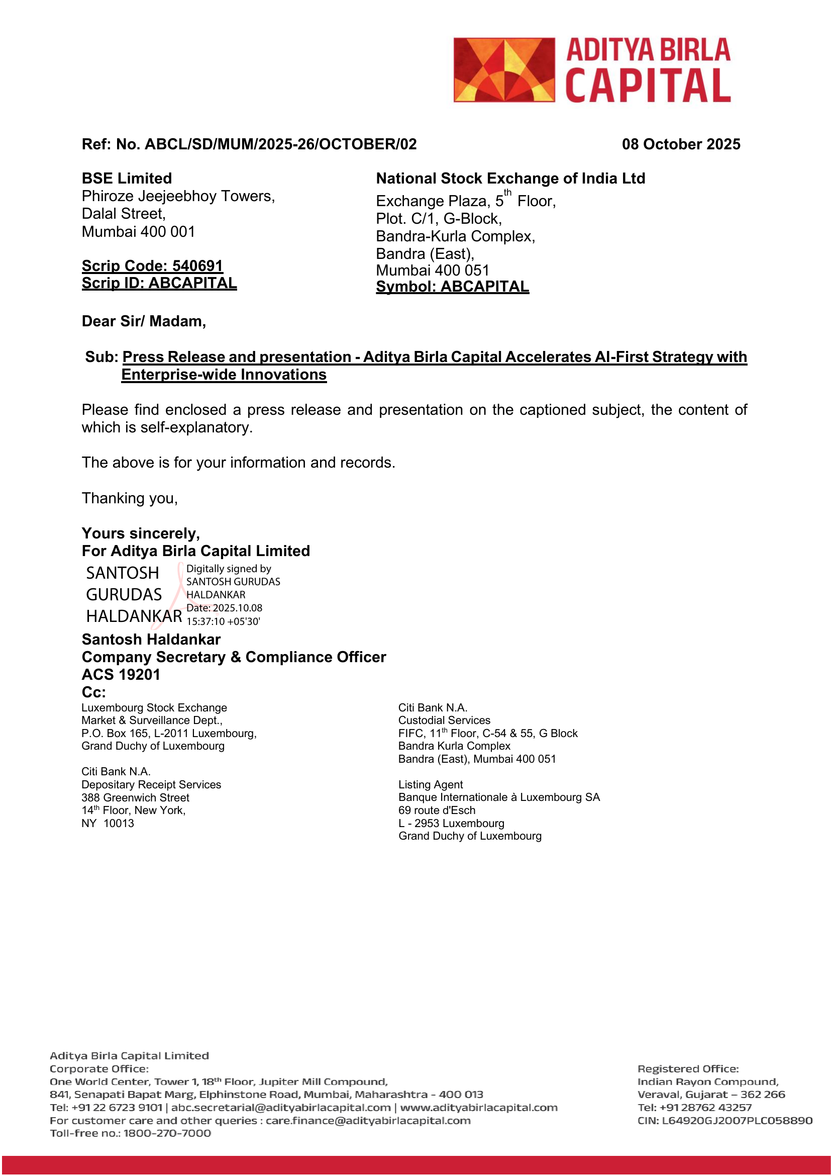 Aditya Birla Capital Launches AI Features Amid Strong FY25 Results Aditya Birla Capital has introduced AI-powered features on its ABCD platform, including tools like SimpliFi and Know Your Policy, to enhance customer experience and operational efficiency. The company reported FY25 revenue of ₹47,369 crore, PAT of ₹3,142 crore, and a 33% CAGR in its lending book from FY22 to FY25, indicating robust growth. Original Filing: www.bseindia.com/stock... $ABCAPITAL.NSE